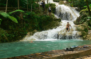 Menikmati keindahan air terjun kecil dan pemandangan hijau pegunungan sekitar.